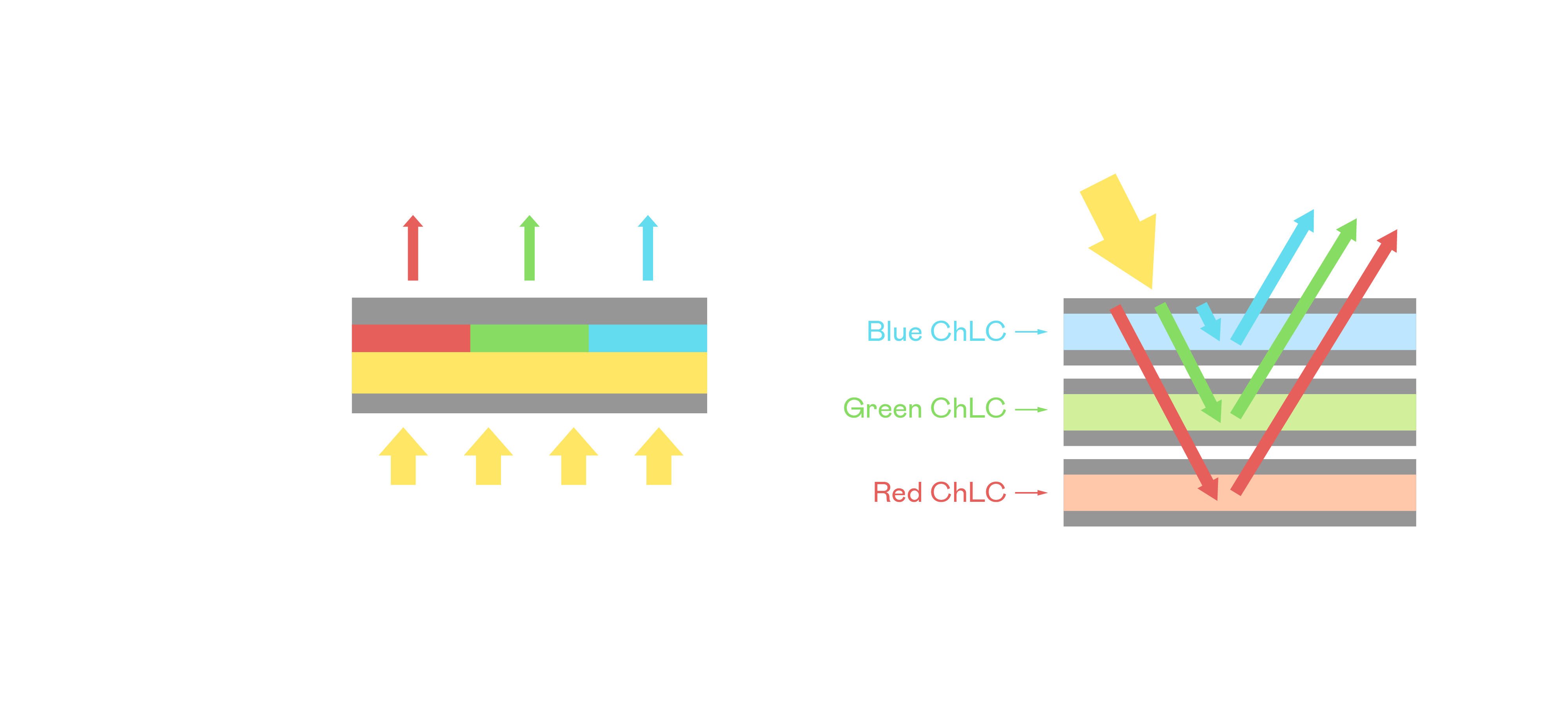 九游会(J9)胆固醇液晶显示器是由红、绿、蓝三层胆固醇液晶面板堆叠而成,并采用无彩色滤光片设计,减少环境光在反射过程中的损耗。