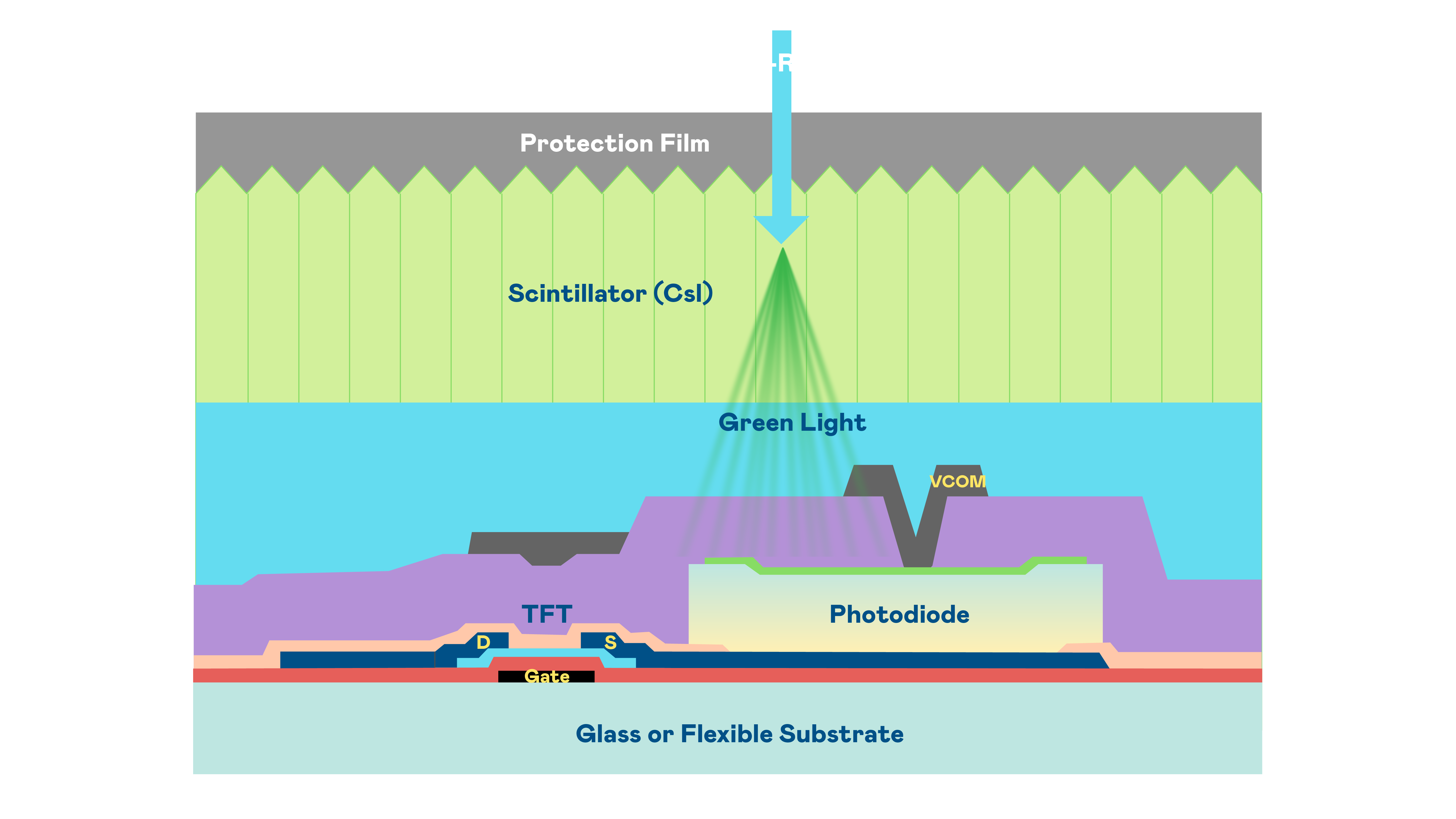 九游会(J9)的X光影像感测阵列使用薄膜电晶体 (TFT) 作为每个像素的读取开关,搭配光电二极体(Photodiode)的光电转换元件,用以感测X光影像讯号。